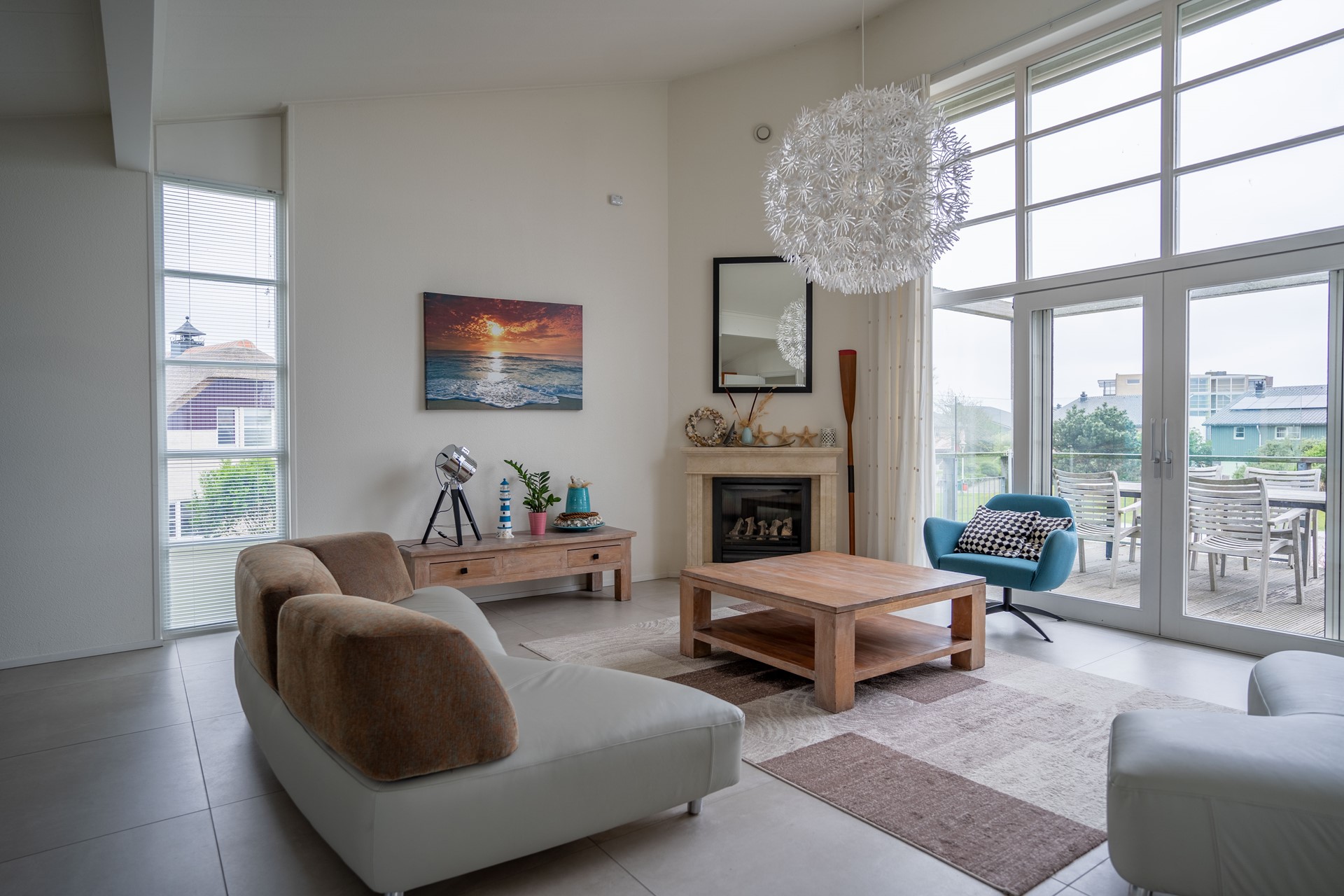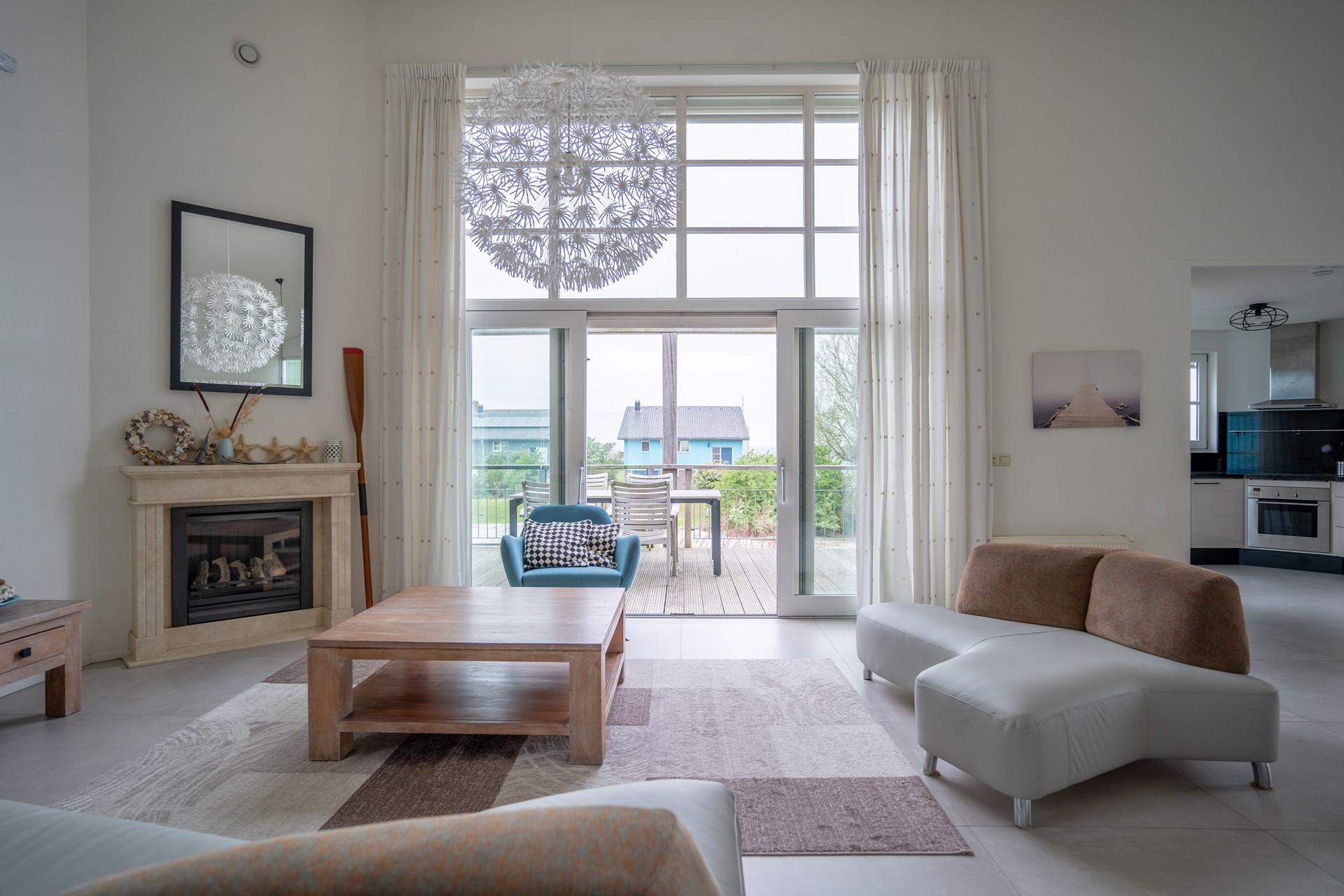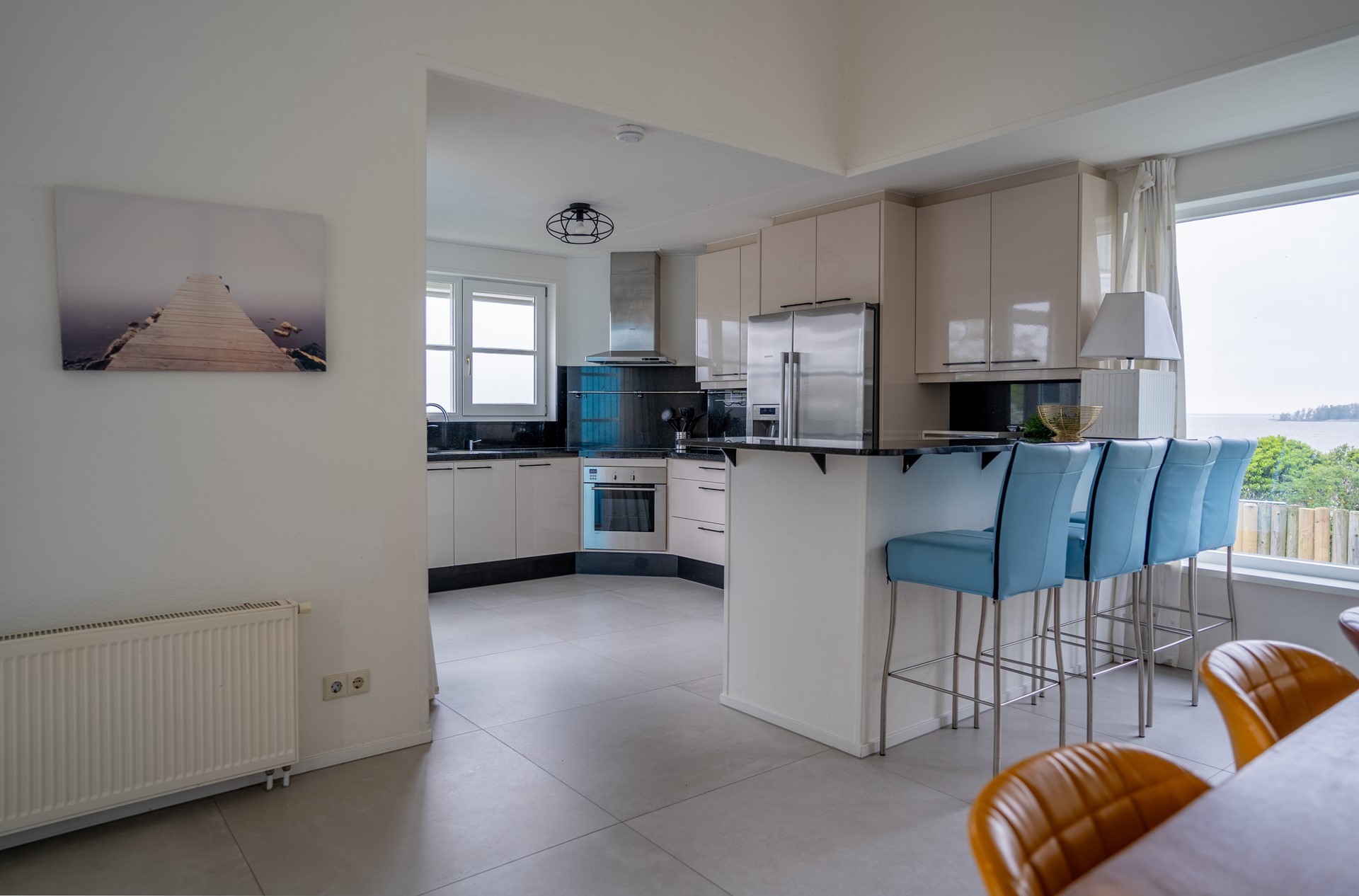 Entree op de verdieping, meterkast en modern toilet (zwevend), ruime living met open keuken, haardpartij en schuifpui naar het hardhouten terras op de westzijde. Op de vloer zijn moderne betonlook plavuizen gelegd en maken het geheel modern en sfeervol. Vanaf het terras is er een trap naar de achtertuin, die grenst aan het kleine strand. De moderne keuken in een grijze kleurstelling is van luxe voorzien net als de gehele living met zijn fraaie interieur en stoffering. En dan het panoramaraam…, dit raam geeft een extra wijds zicht over het IJsselmeer waar de windsurfers voorbijschieten.