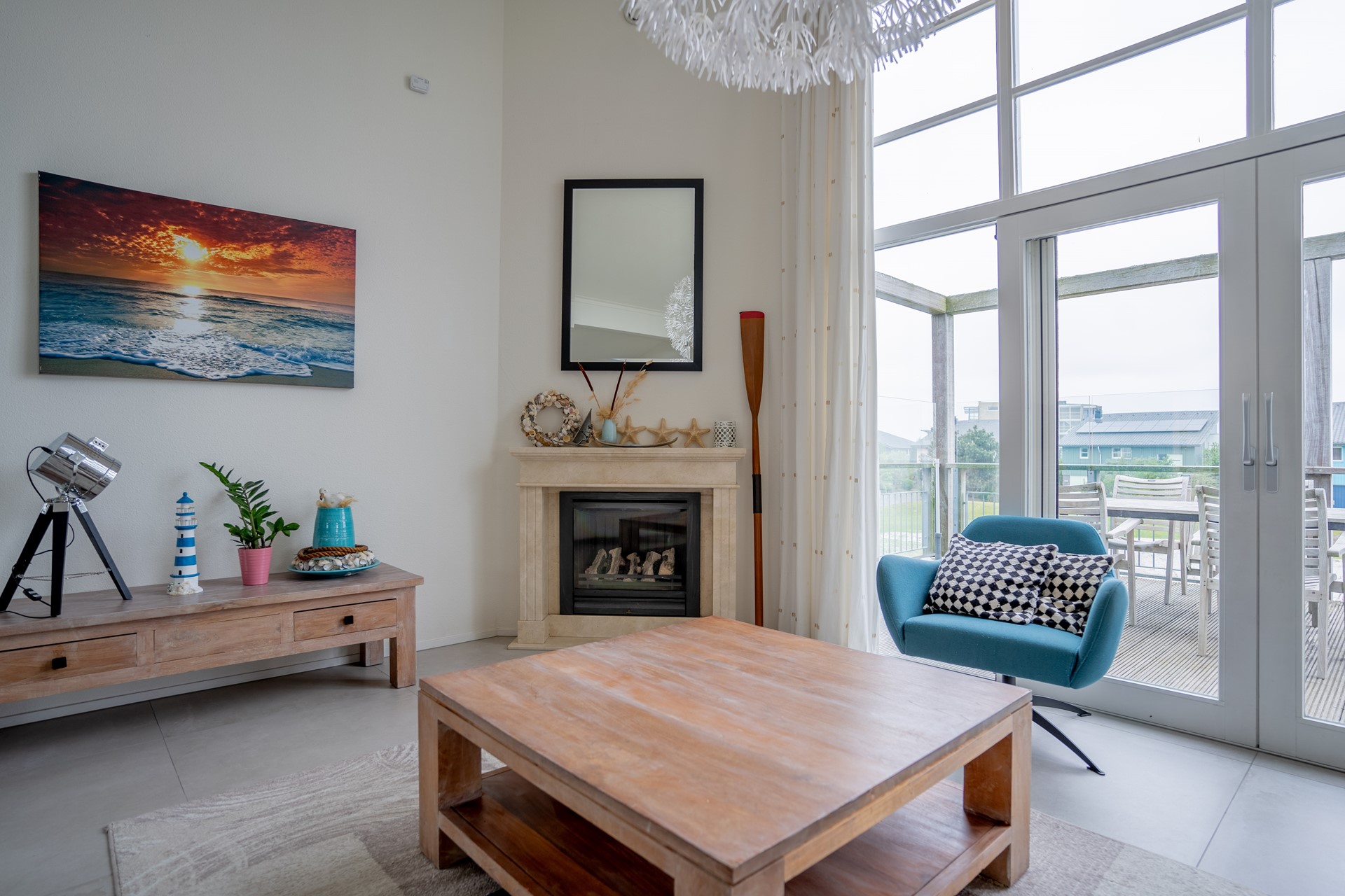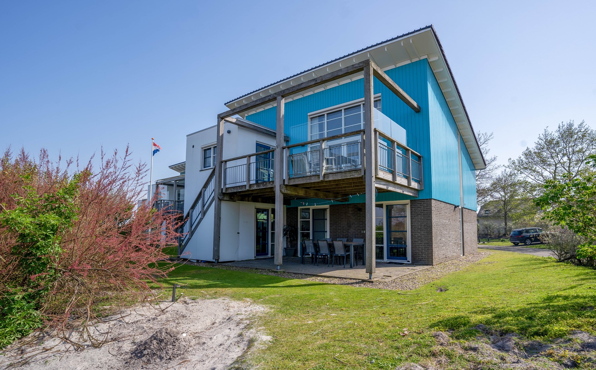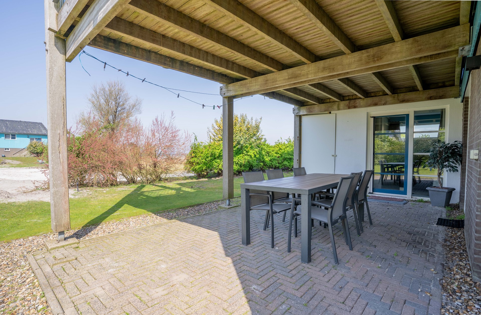Vanuit de living loopt u door de schuifpui het hardhouten terras op. Vanaf hier ziet u de zon achter de Afsluitdijk ondergaan. Hier is fraai tuinmeubilair geplaatst vanwaar u de surfbaai kan overzien. De houten trap verbindt dit terras met de tuin vanwaar een doorgang is naar het strand. De tuin is zuidwest georiënteerd.