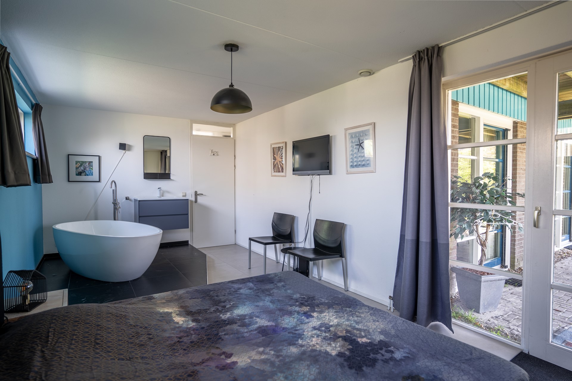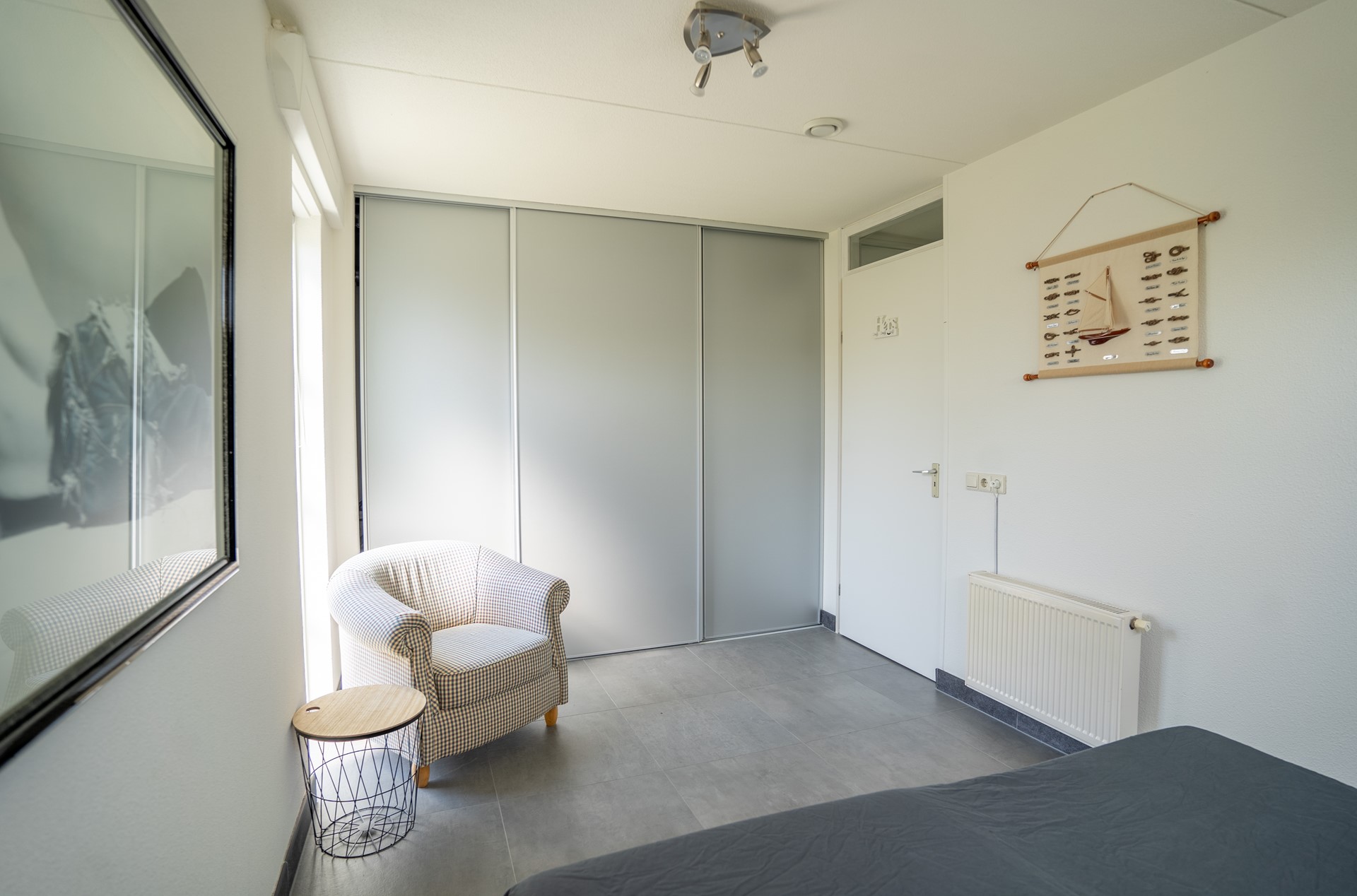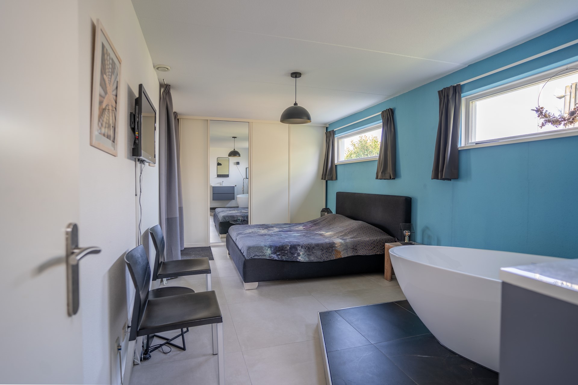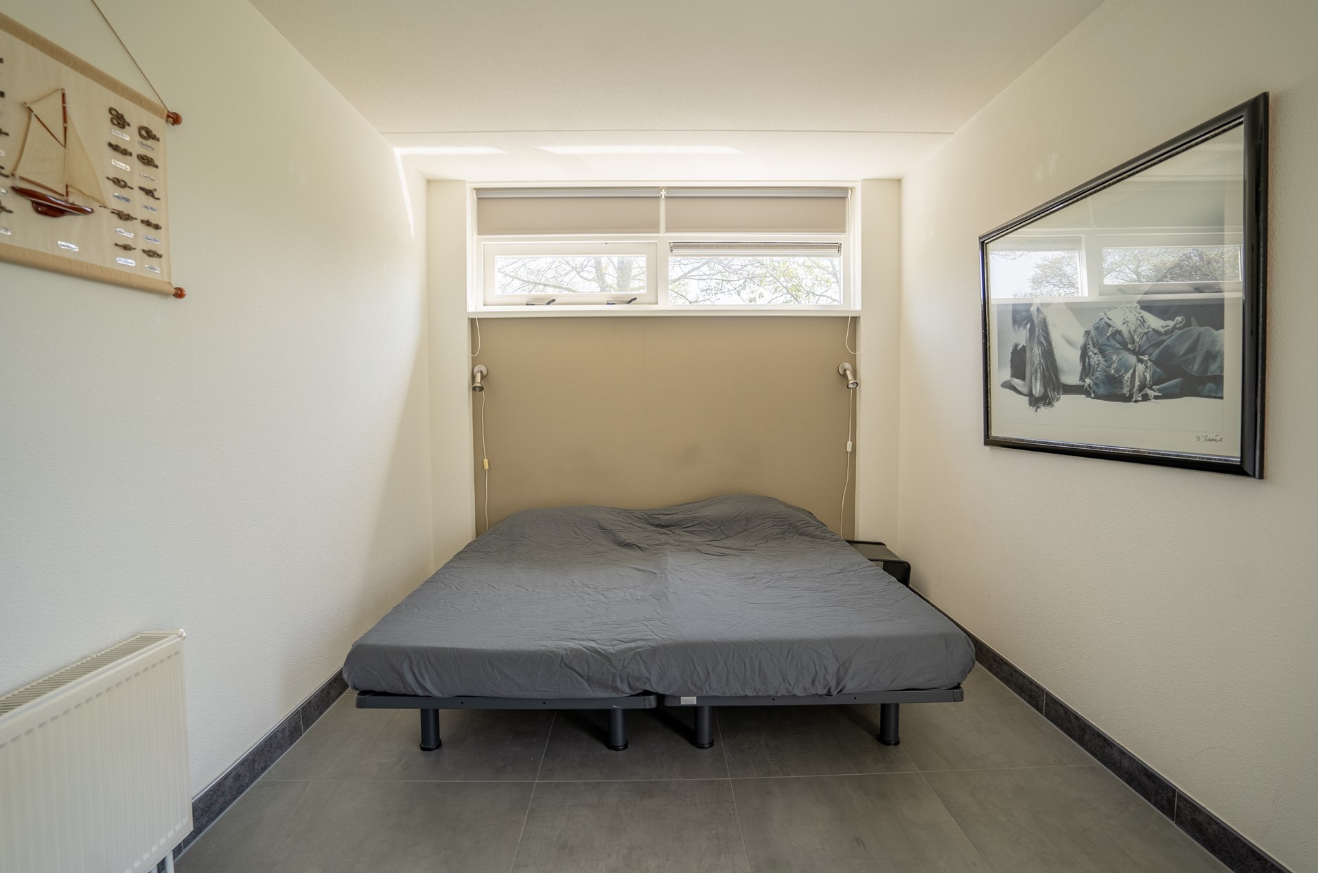 De 4 slaapkamers bevinden zich op de begane grond. De ouderslaapkamer beschikt over een bijzonder vrijstaand ligbad. Drie slaapkamers zijn voorzien van een buitendeur naar de achtertuin. De badkamer is in 2021 opnieuw ingericht en is uitgerust met een douche/stoomcabine, wastafel en infraroodsauna. Onder de trap bevindt zich een extra berging waar ruimte is voor de wasmachine.