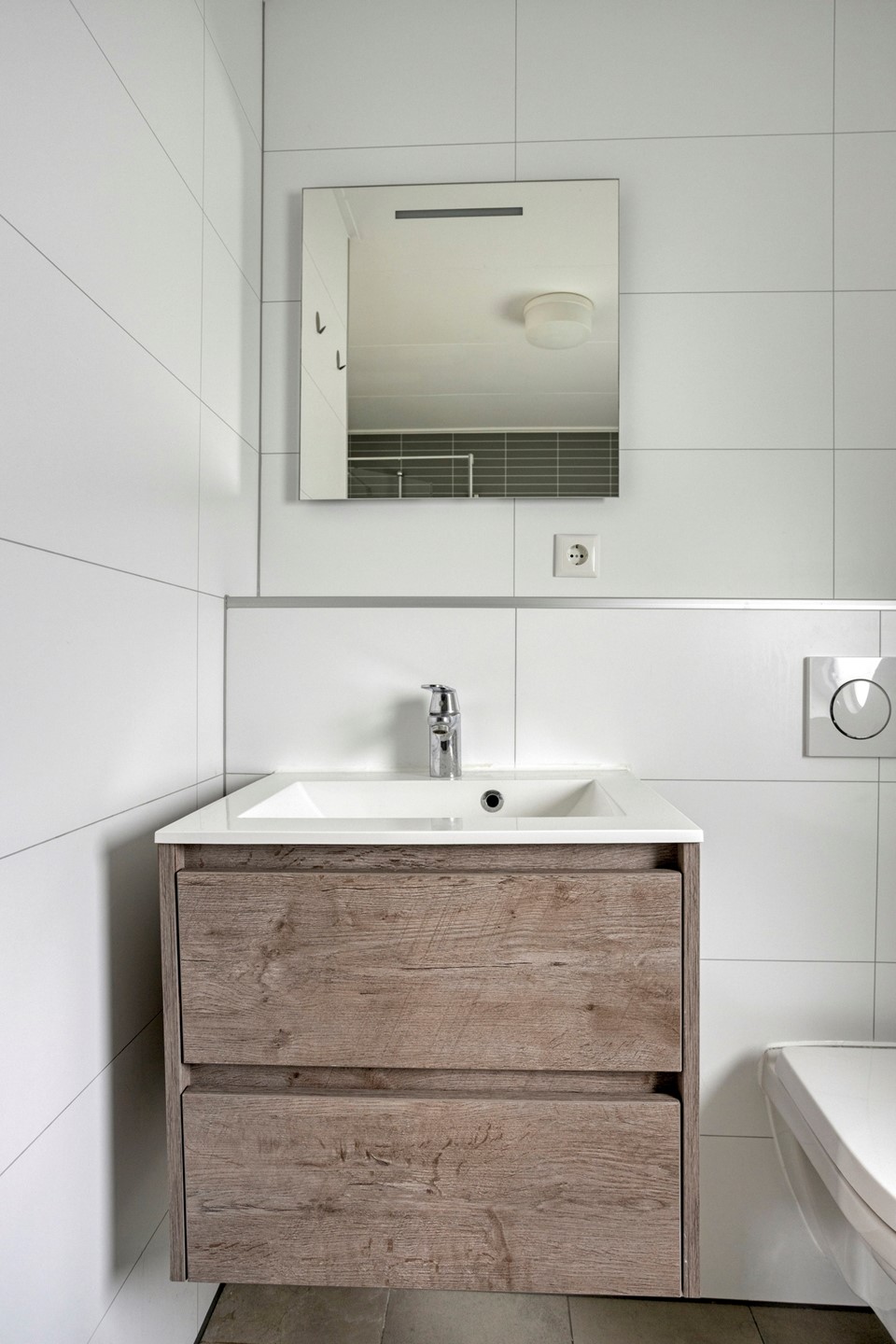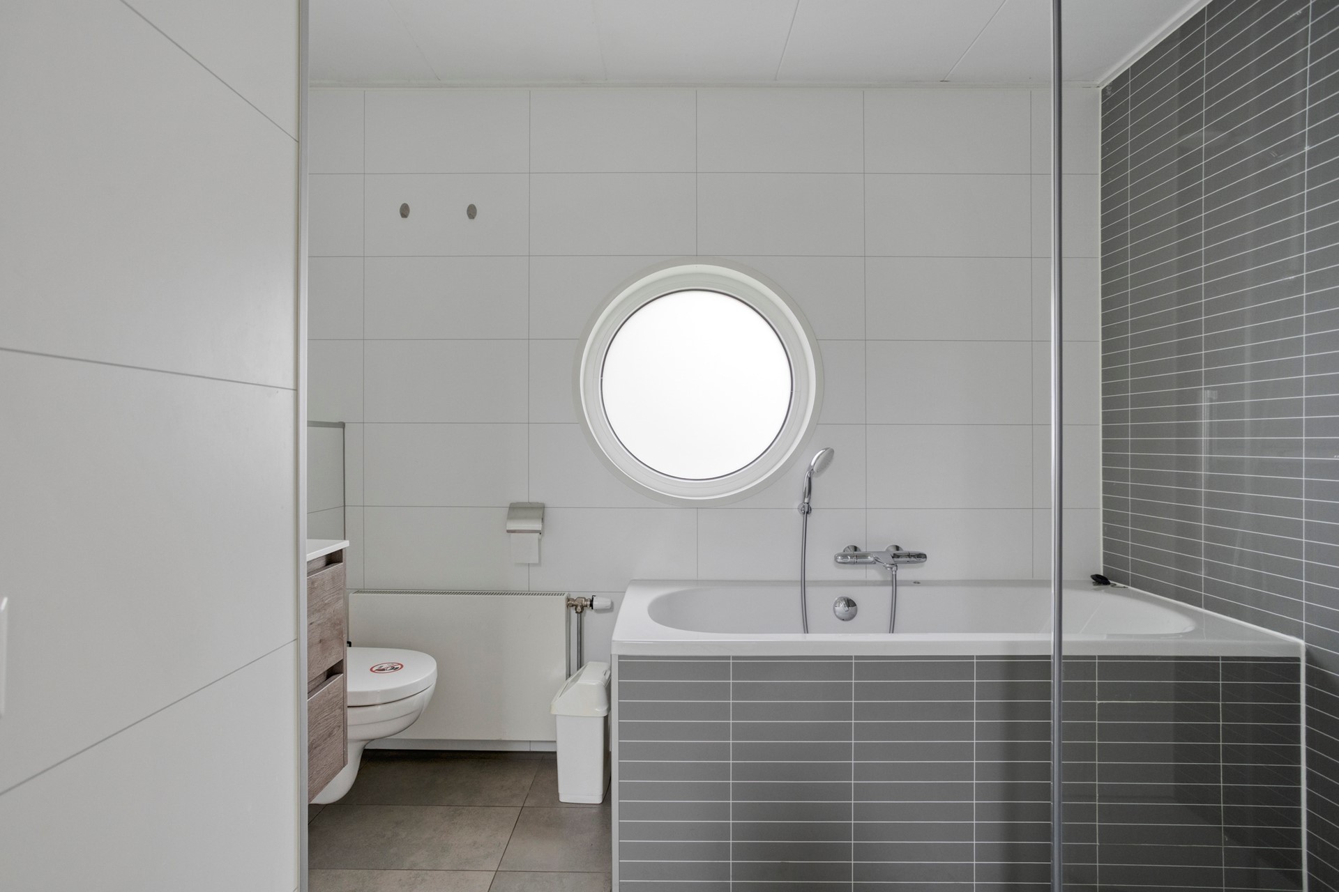 De overloop geeft toegang tot 3 slaapkamers waarvan er 2 zeer ruim zijn. De moderne badkamer is voorzien van een tweede toilet, douchecabine en ligbad. De badkamer is uitgevoerd in een grijs met witte kleurstelling. Achter de trap bevindt zich een afsluitbare eigenaarskast, waardoor deze woning uitermate geschikt is voor de combinatie van verhuren en zelf genieten.