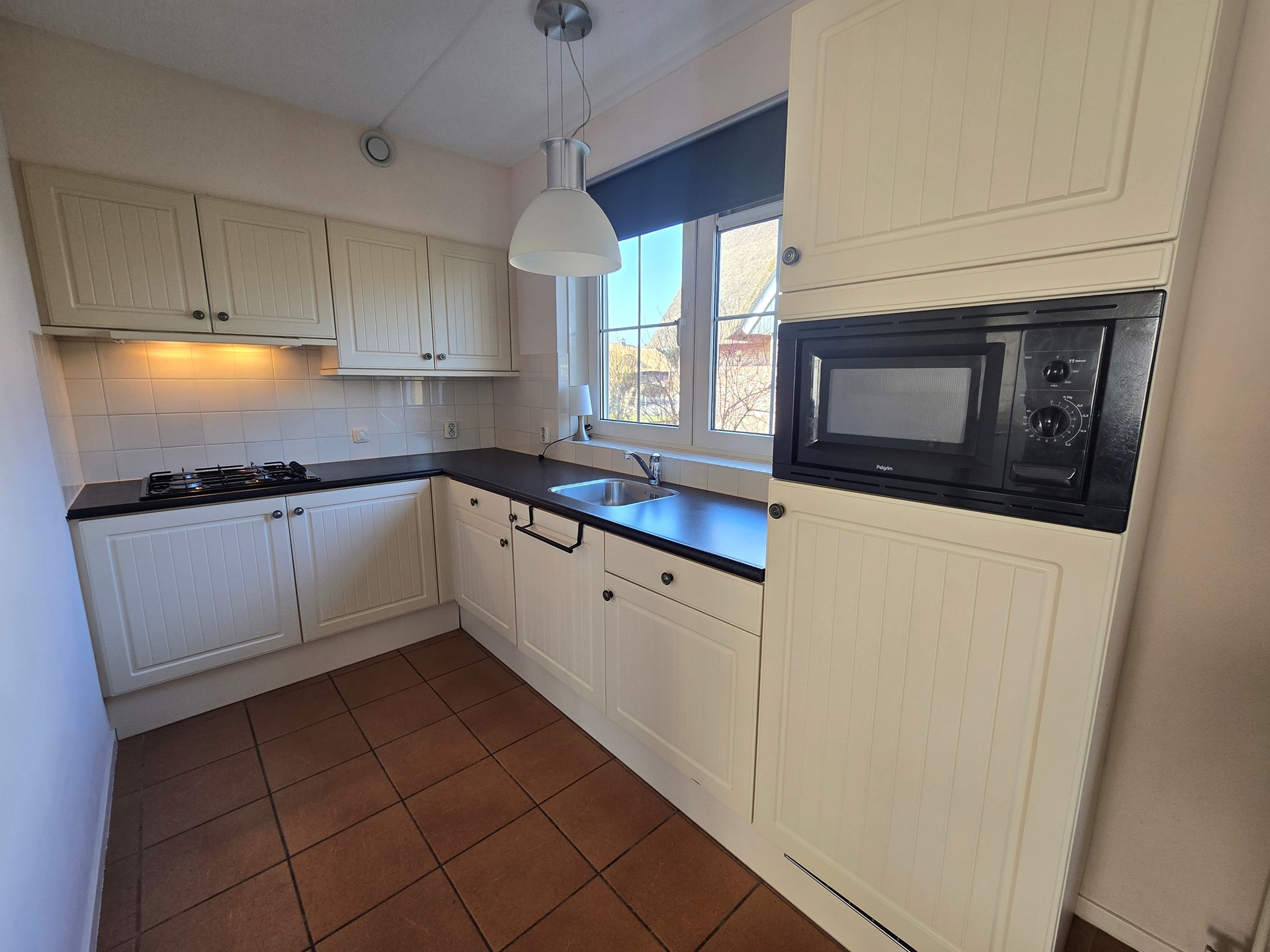 Entree naar de centrale gang alwaar de opgang naar de verdieping is en toegang tot de living en de luxe badkamer. De living beschikt over openslaande deuren naar het terras en de ruime tuin rondom de woning. De openkeuken voorzien van inbouwapparatuur. De badkamer bevindt zich op de begane grond en is uitgevoerd met onder andere een ligbad.
