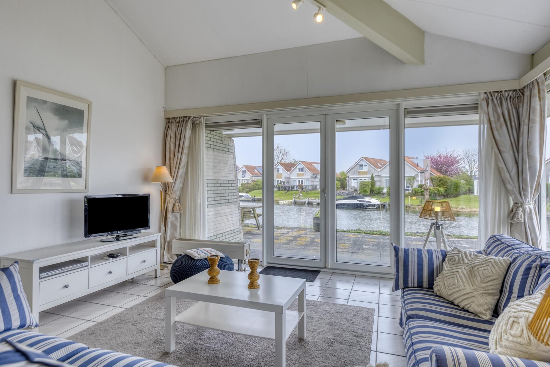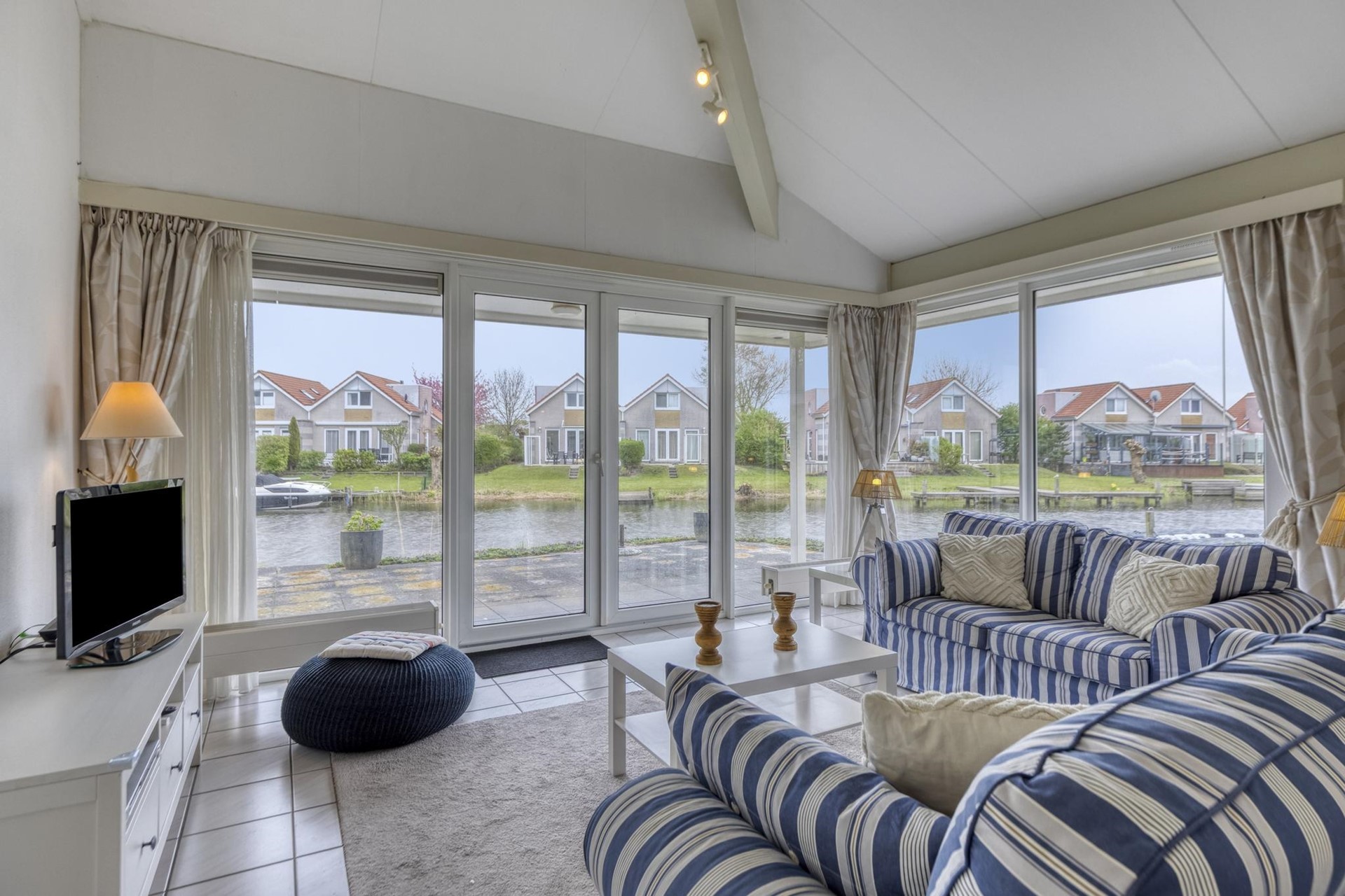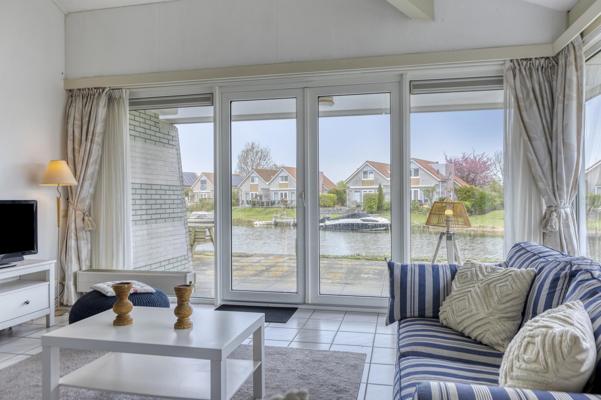 De lichte living is heerlijk gesitueerd richting het water en biedt prachtig uitzicht dankzij een extra venster in de hoek. Via de openslaande deuren stap je zo het terras en de groene tuin in.