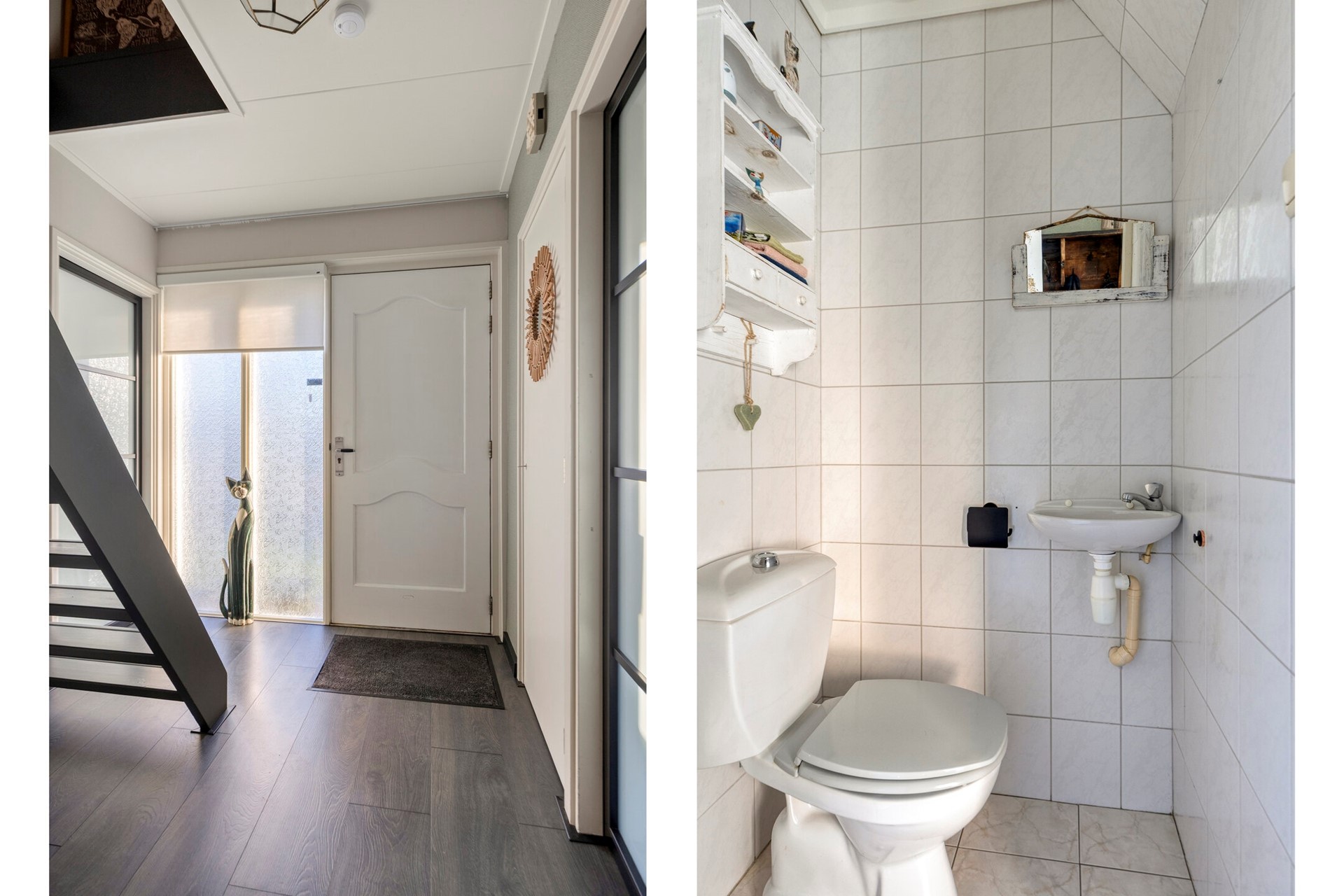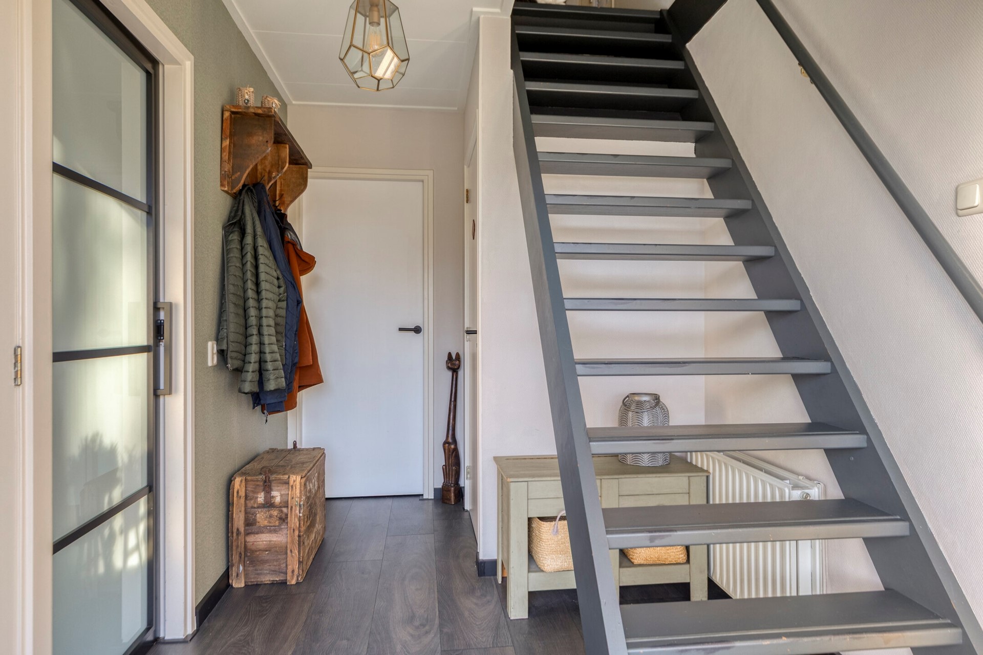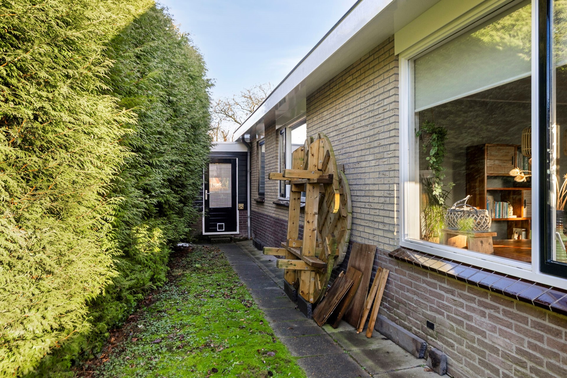 Via de centrale entree komt u in de hal die toegang biedt tot alle vertrekken. Aan de linkerzijde bevindt zich de lichte woonkamer met openslaande deuren naar het zonnige terras. Hier geniet u in alle rust en privacy, beschut achter het windscherm – een heerlijke plek om buiten te zitten.