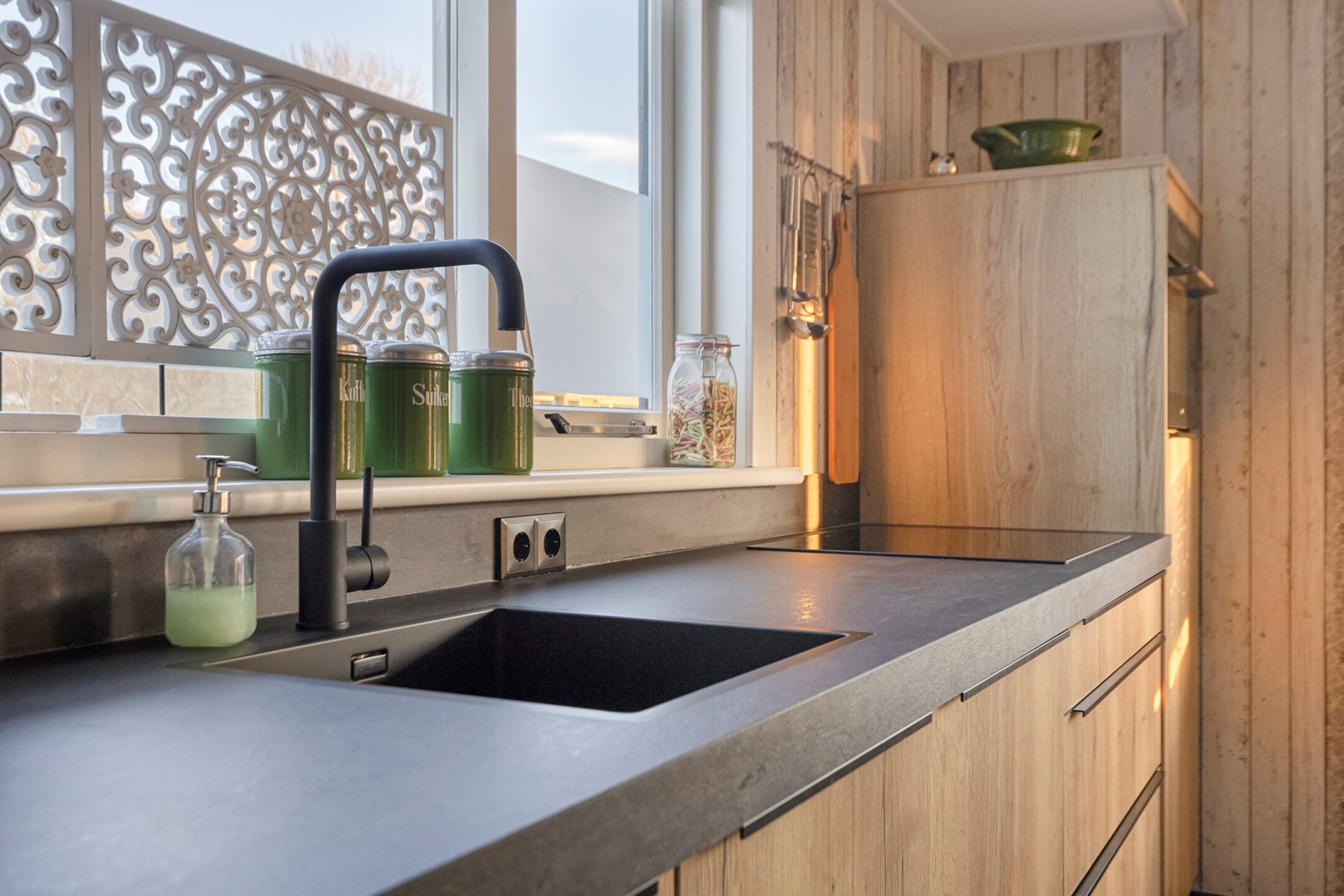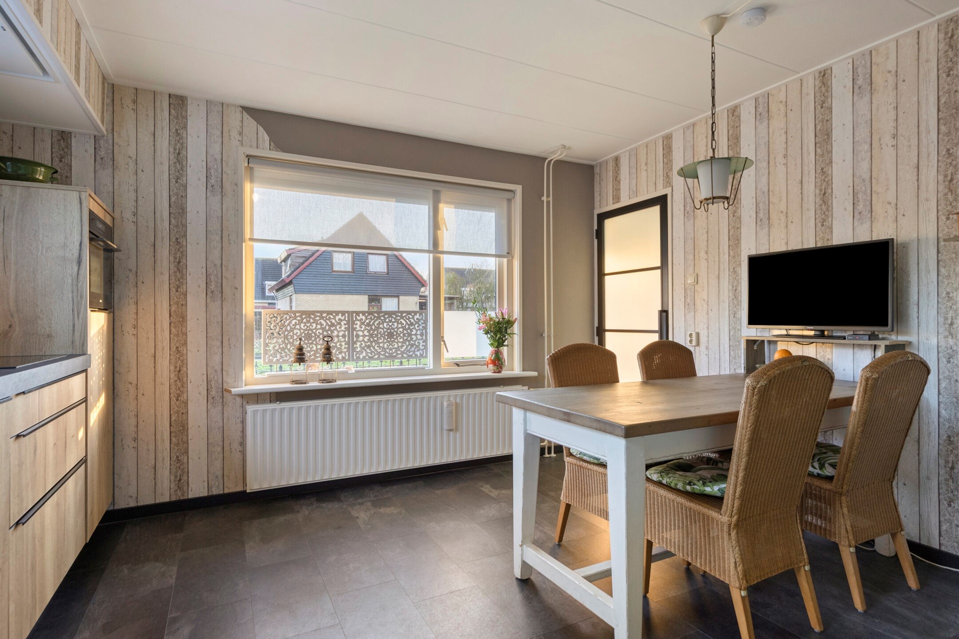 Aan de rechterzijde van de hal ligt de keuken, overdag het kloppend hart van de woning. Deze is uitgerust met een diep aanrechtblad en moderne inbouwapparatuur zoals een inductiekookplaat, afzuigkap, combi-oven, koelkast, close-in Boiler en vaatwasser.