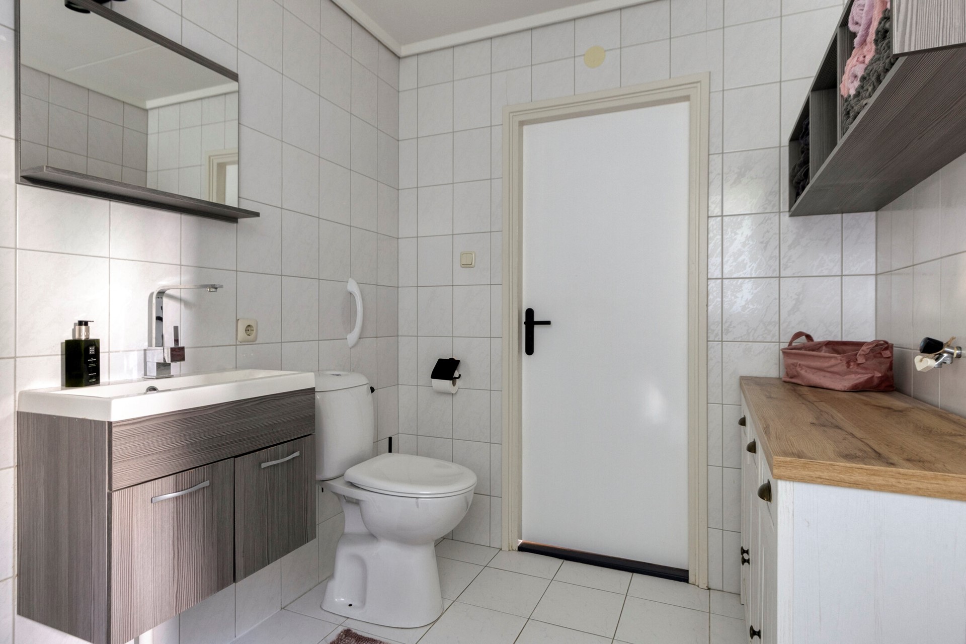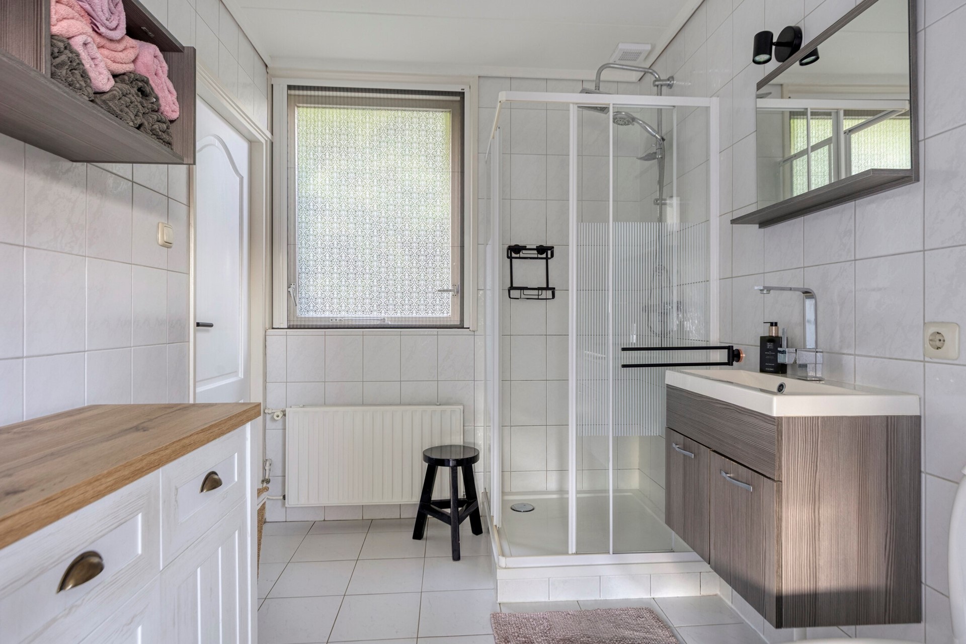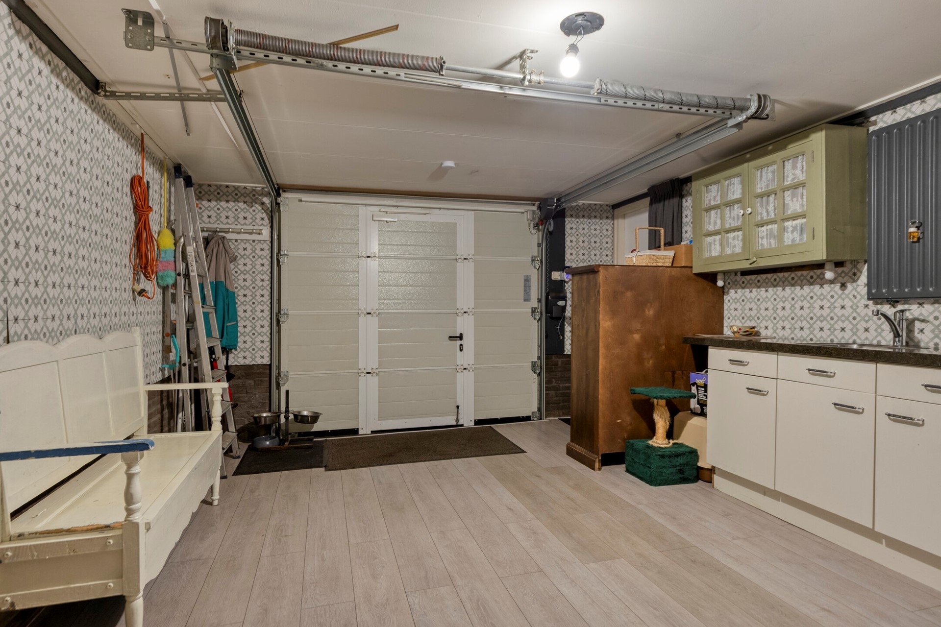 Aan de achterzijde van de woning bevindt zich de comfortabele tweepersoonsslaapkamer met aansluitend de badkamer. De badkamer is voorzien van een douchecabine, wastafelmeubel en een tweede toilet. De aangrenzende garage is binnendoor bereikbaar via de keuken en is multifunctioneel te gebruiken, bijvoorbeeld als hobbyruimte. Hier vindt u tevens de aansluiting voor de wasmachine.